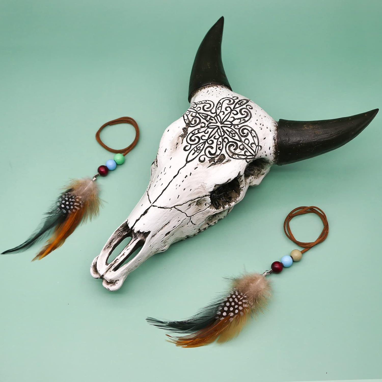 - Beautiful 3D Boho Bull Skull Wall Decor - This simple white bull skull is beautifully sculpted with boho geometric patterns, featuring flowing feathers, vintage bead accessories, and it can be DIY decorated to match your preferences and decorating style!