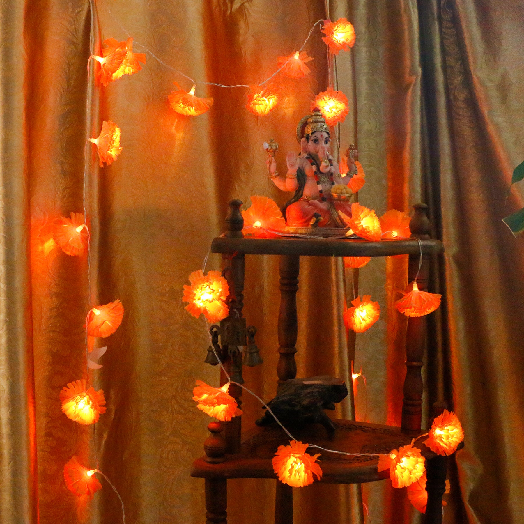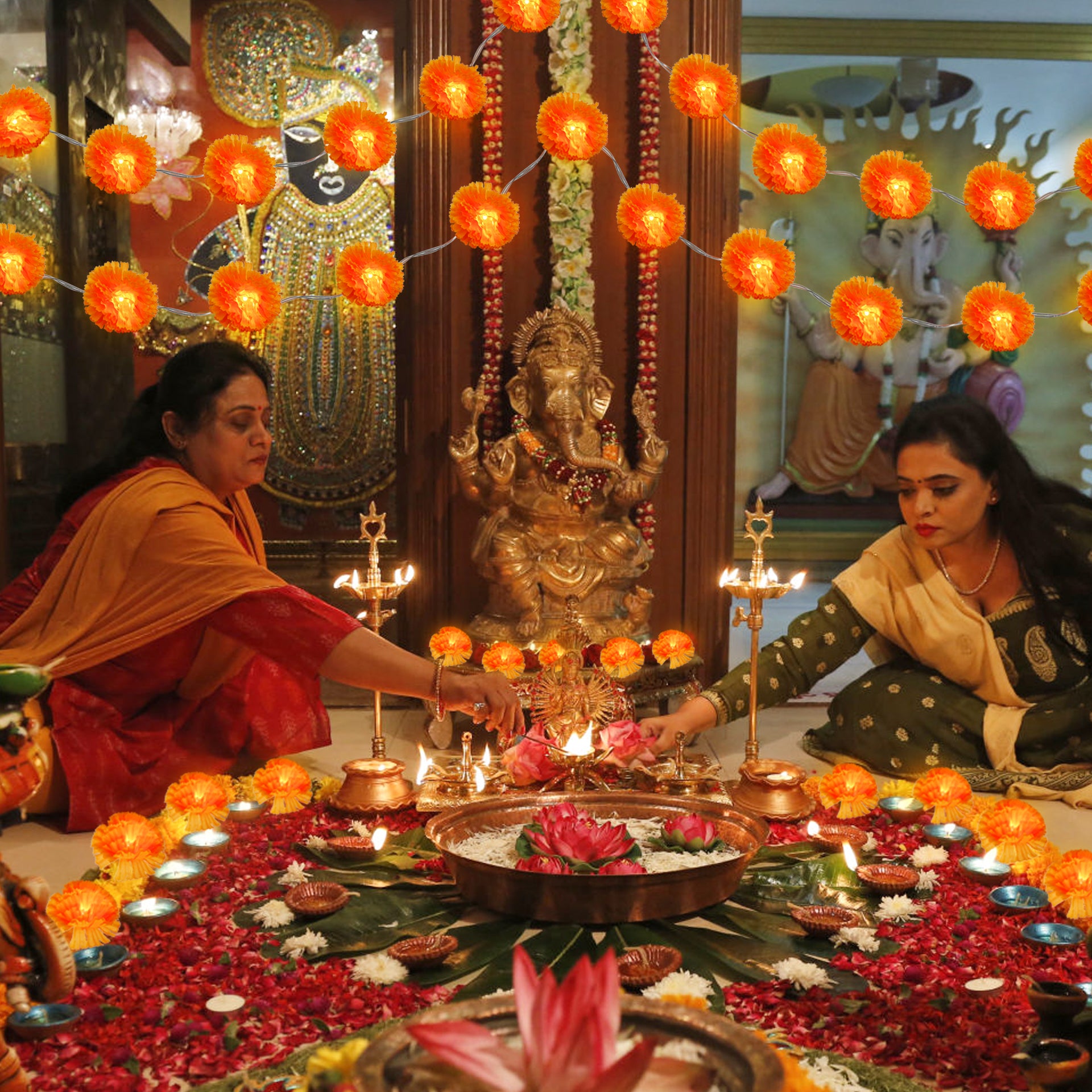 - πΌ Realistic Marigold Flower Design: Features 20 LED lights embedded in lifelike fabric marigold flowers, creating a beautiful and authentic floral garland effect for your home temple,mandir, or puja room altar,door, wall and stairs etc.