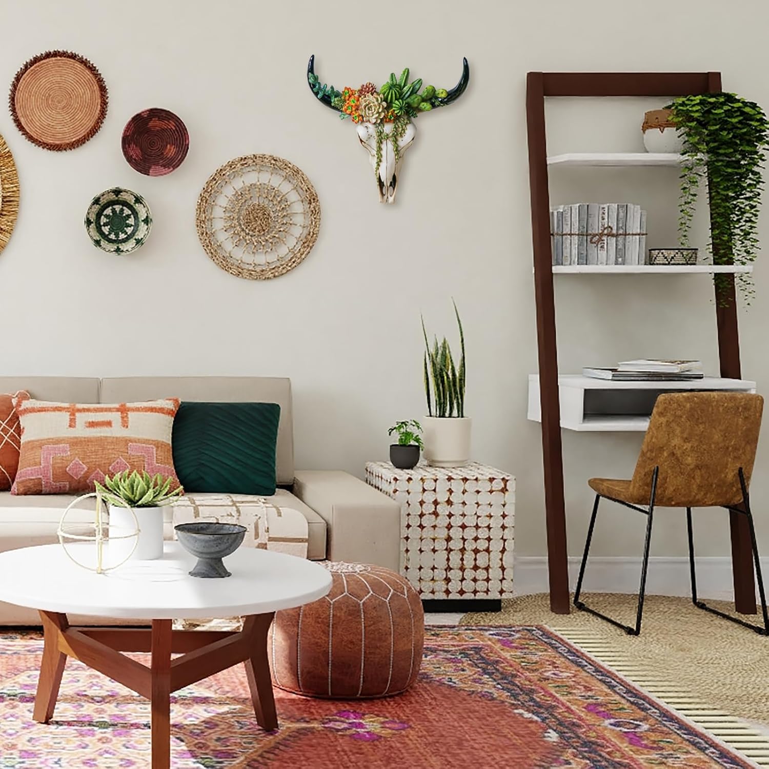 - Stunning Tribal Wall Decor Focal Point - The white-based bull skull is a versatile color on any wall, and paired with faux floral succulent elements on top of the skull, intricate details and lifelike textures make it a charming focal point that effortlessly enhances Perfect for your living room/bedroom wall decoration.