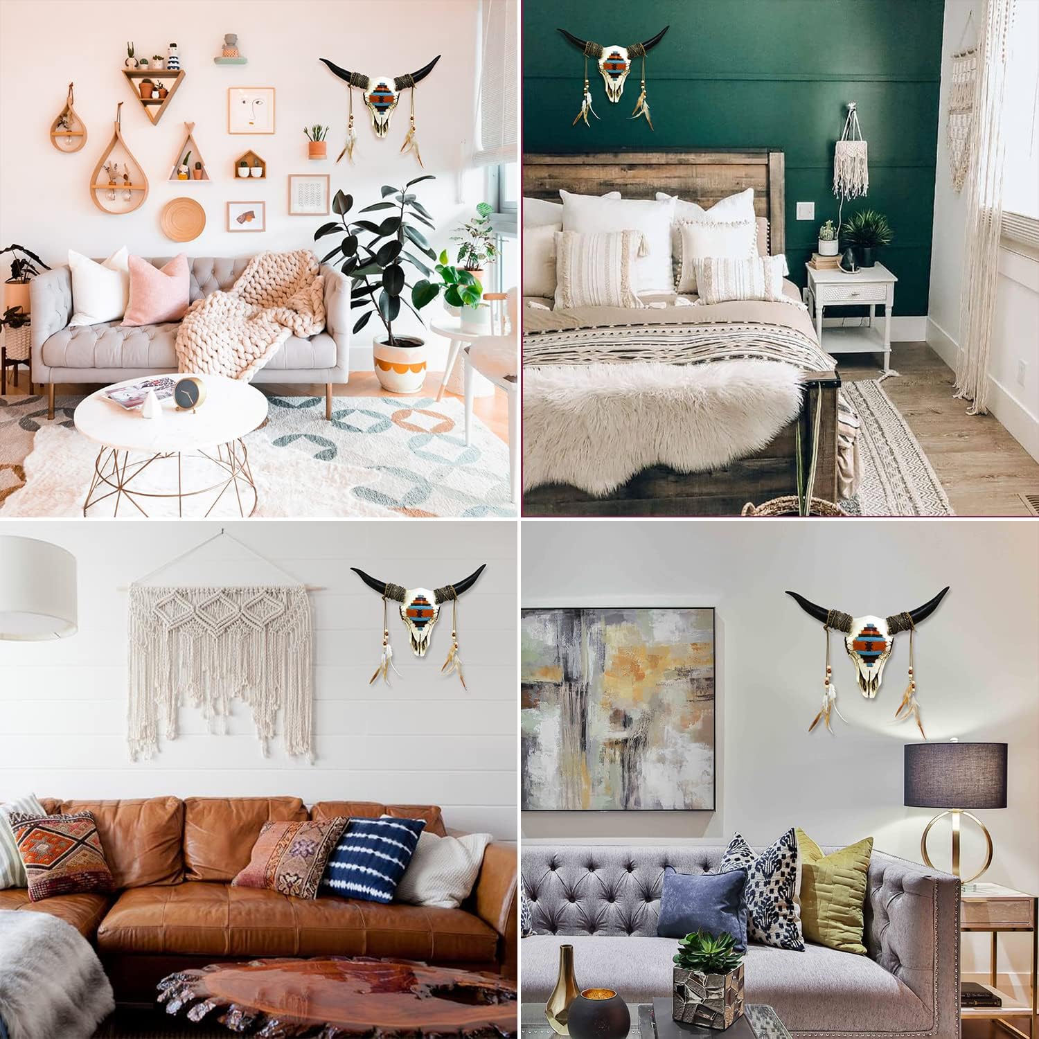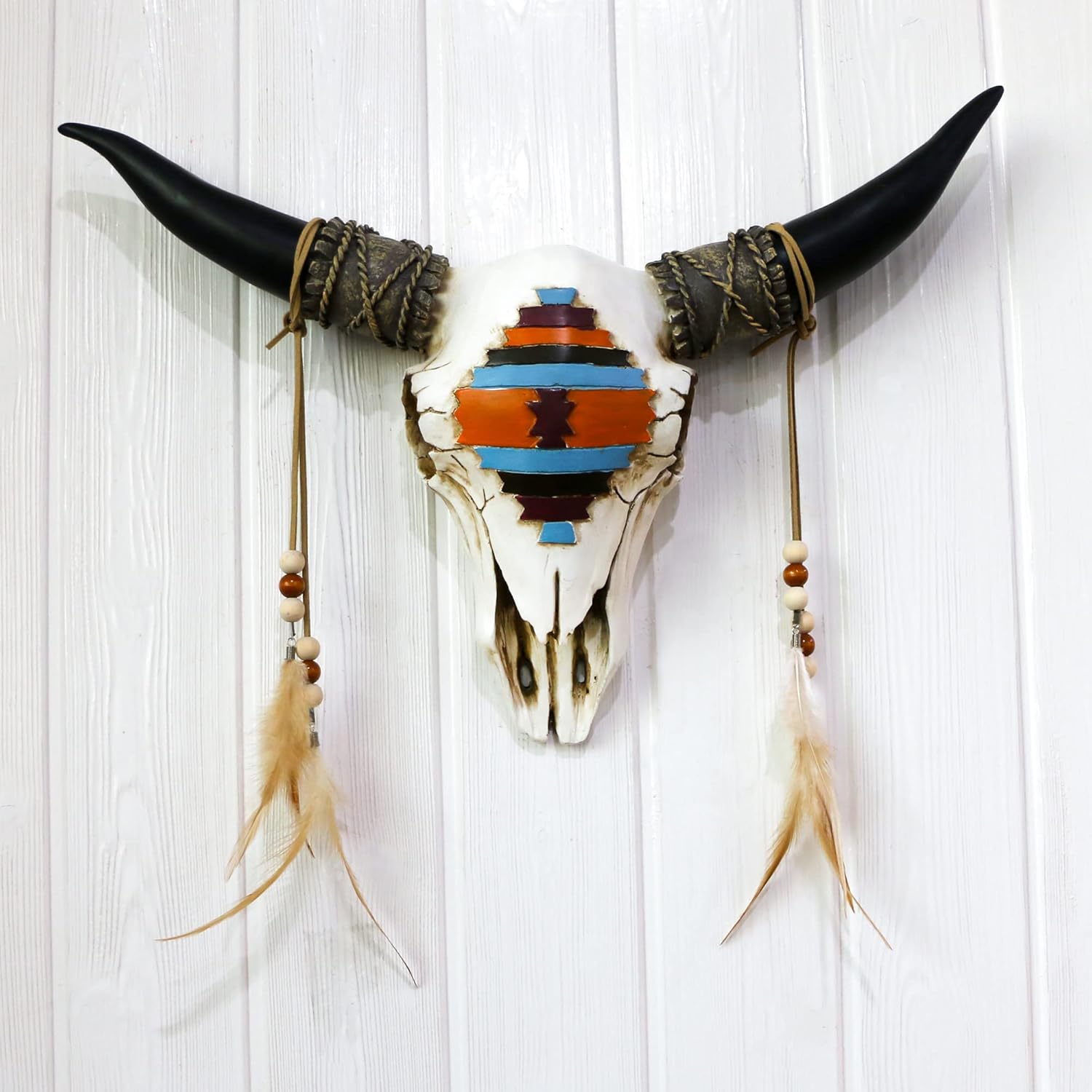 - Southwestern Bull Skull Wall Decor - The high-level and simple hand-painted white skull is matched with a bohemian-style striped diamond design in the middle. The color is retro and strong. The long horns on both sides are very strong and can be hung with elegant feather knots. Liven up the wall in a second and add an authentic southwestern wall decor style!