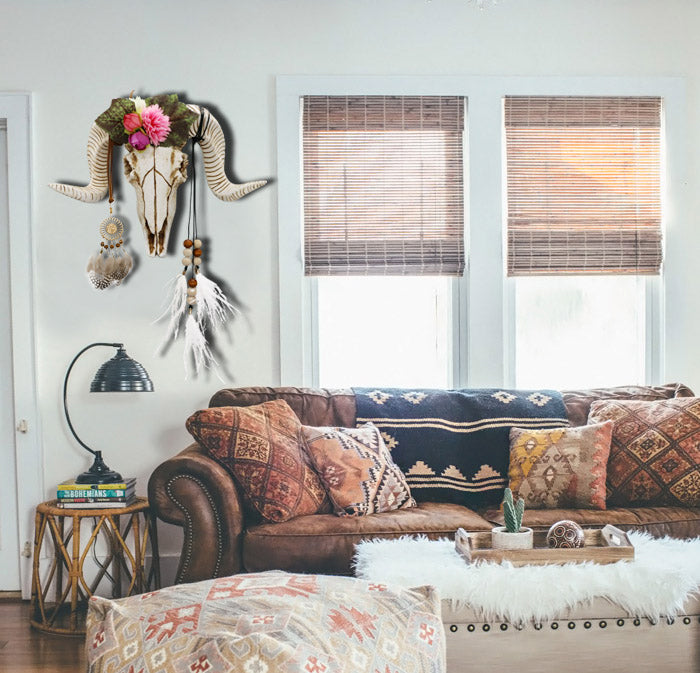 - This sheep head wall Décor is designed to look like it has been weathered over time, giving it a tribal country feel, and combined with superb hand-painting to give a naturalistic and realistic effect. With dreamcatcher pendant, flower and white feather pendant accessories, feel free to decorate to match your preference and decorating style!