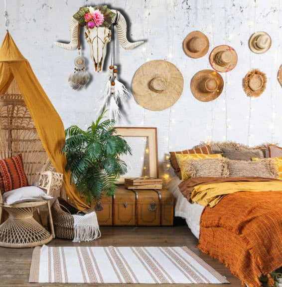 Animal Skull Head Decor - 3D DIY Flower Sheep Head Wall Hanging - Boho Chic Decor Faux Taxidermy Ram Sheep Head Wall Mount w/Dreamcatcher Feather for Bedroom Living Room 21pcs