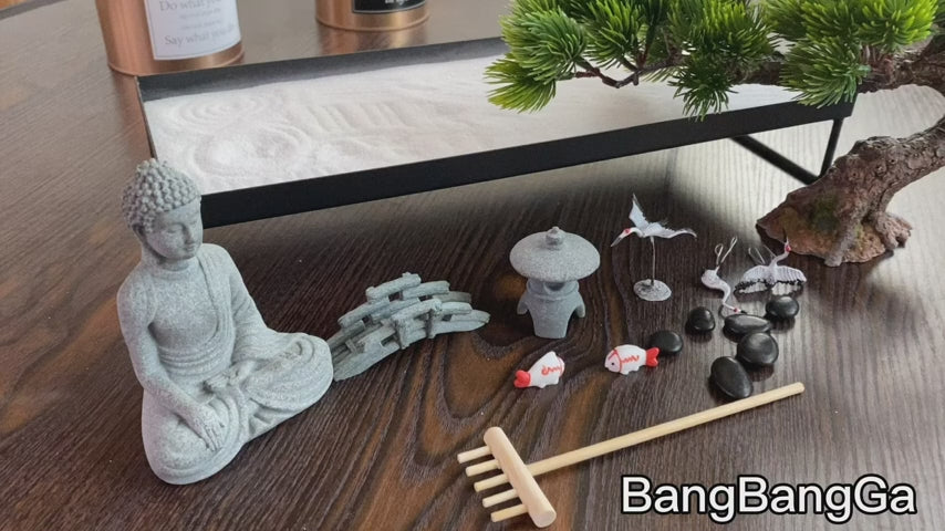 - HIGH QUALITY AND DURABLE - This Zen garden kit has 18 items: 14" X 5.7" X 2.4" large decorative iron tray, hand carved stone bridge, stone pagoda, meditation stone Buddha, black nature river stones, white sand, bamboo rake, cranes, artificial bonsai pine tree and 2 koi! Can be placed in your Zen room, home or office in a quiet meditation corner. Enjoy your own private Zen garden time, even if your space is small.