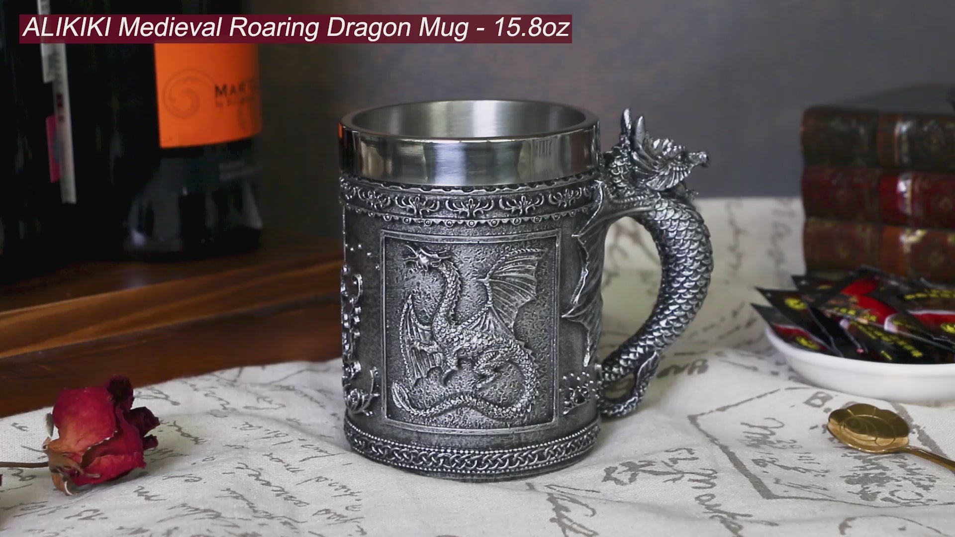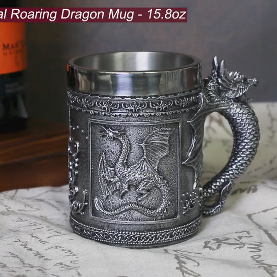- PREMIUM CRAFT UPGRADE - The exterior of this medieval roaring dragon mug is made of high-quality resin. The interior is made of 304 stainless steel lining and is fixed, holding up to 15.8 oz. The mouth of the cup is thick and smooth, with an increased height of 0.6 inches. When drinking, your lips will not touch the cup body, making it more comfortable and safer.It works well for drinking beer, wine, coffee, milk or teas.