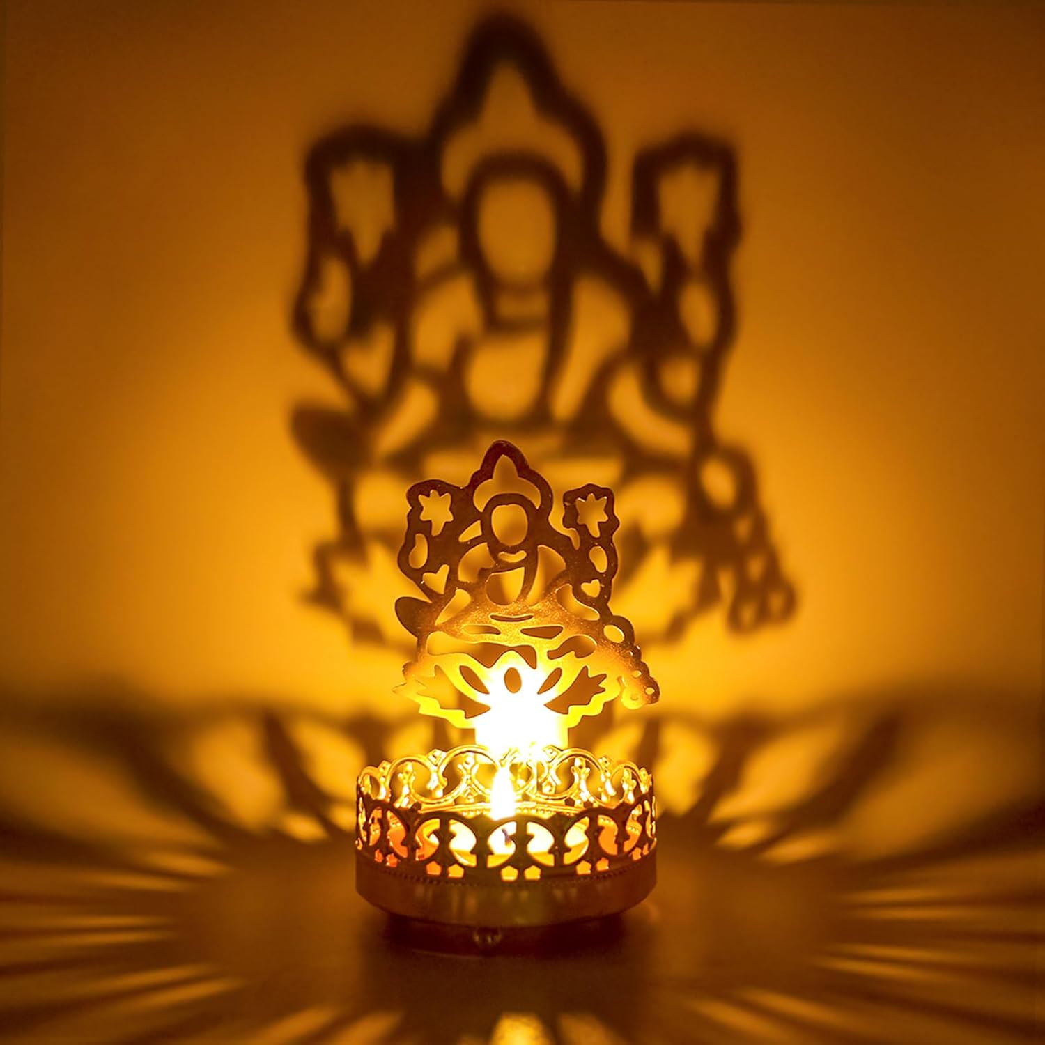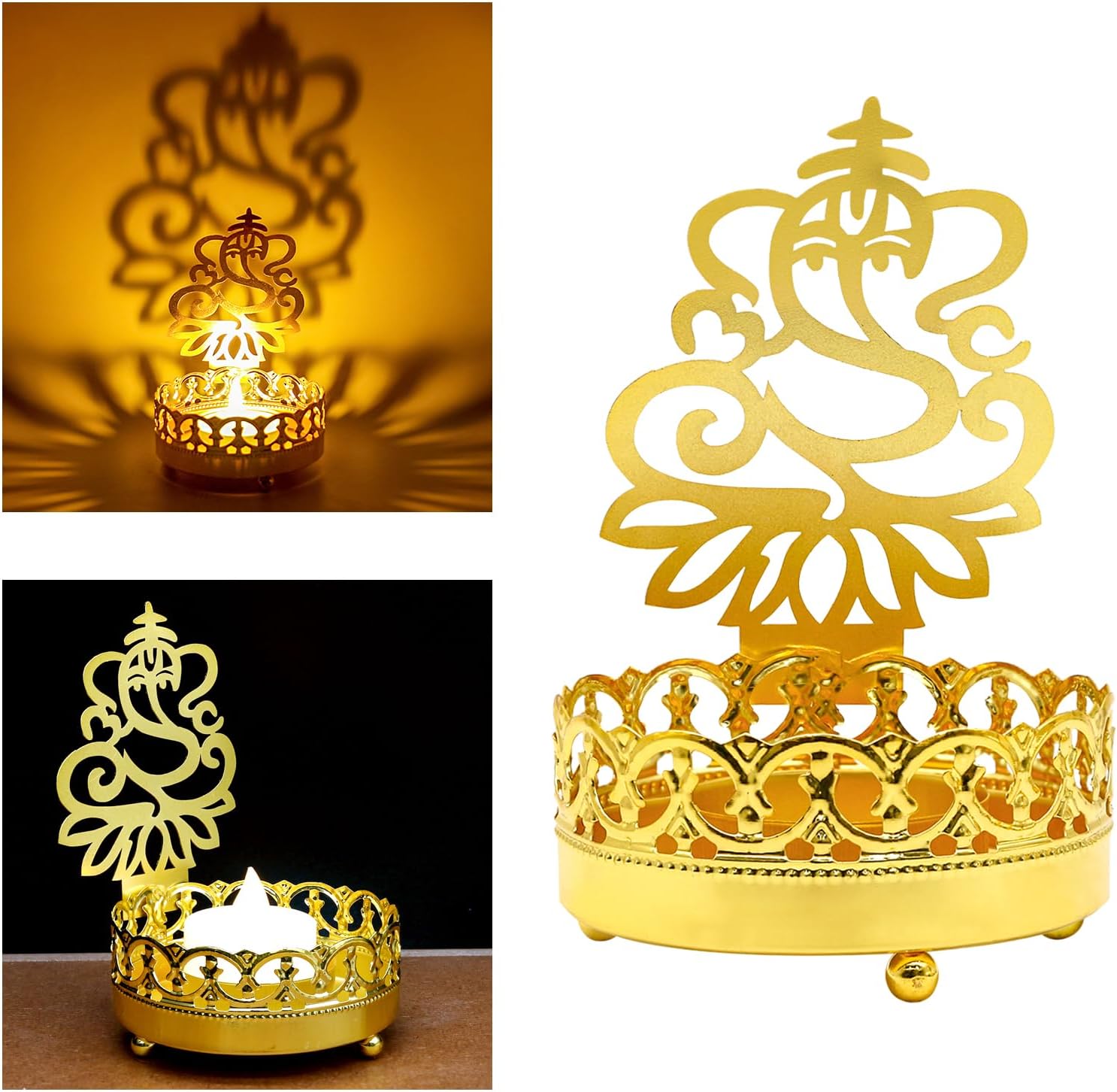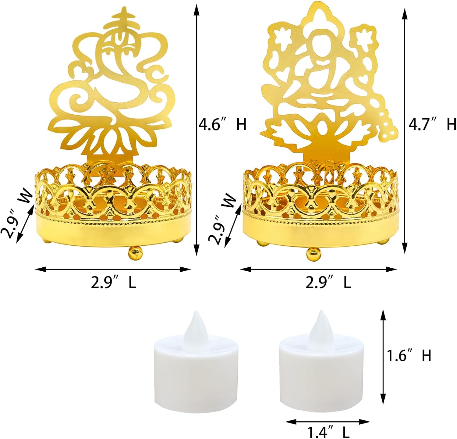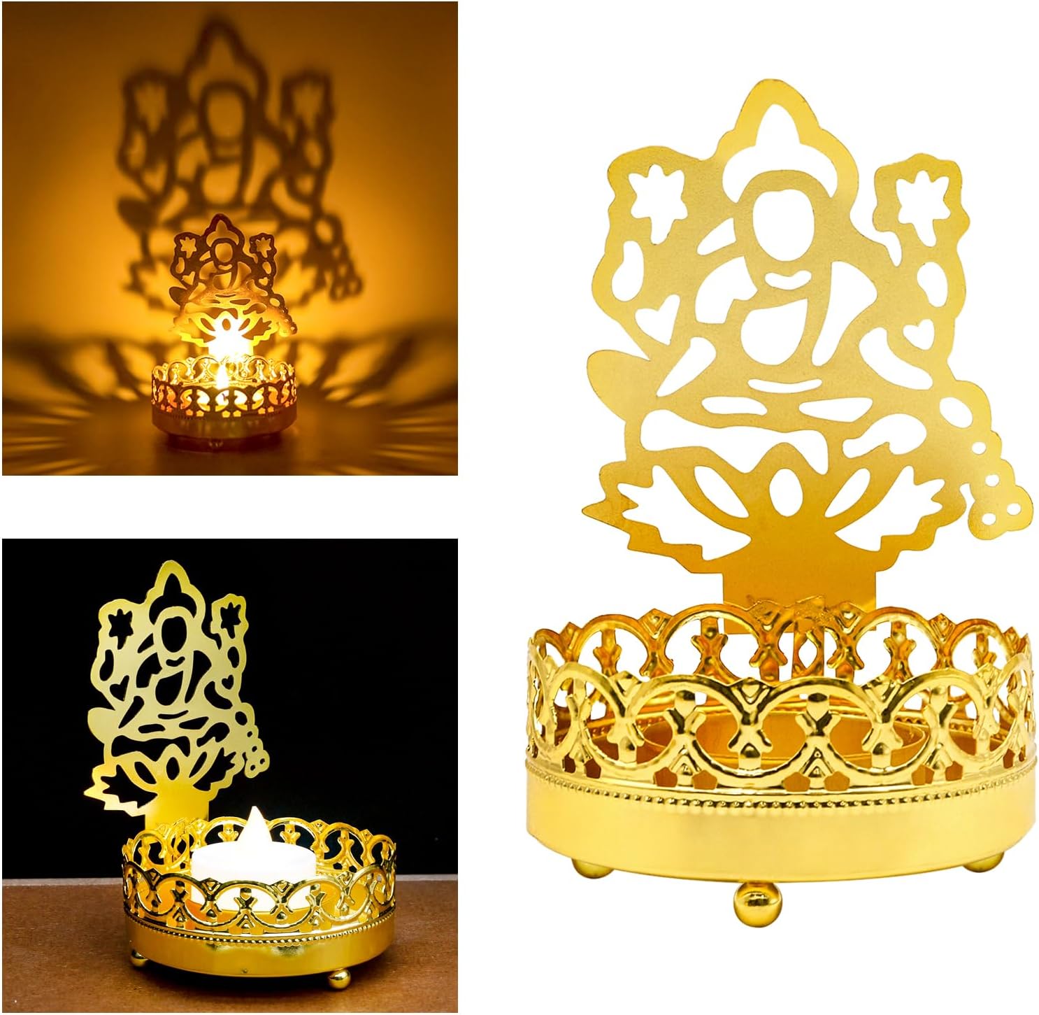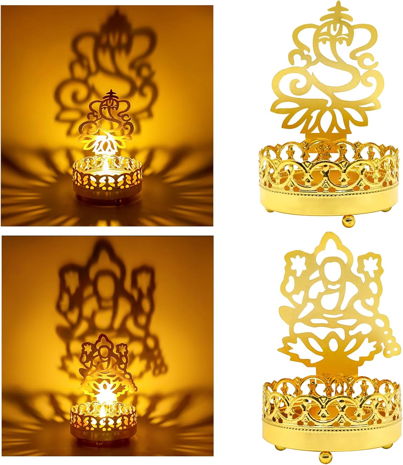 - Exquisite Diwali Shadow Diya Set: Our Golden Shadow Diyas are made of metal, includes a Lord Ganesha shadow diya, a Goddess Lakshmi shadow diya, and two white LED T-lights, adding an elegant touch to your home decor.