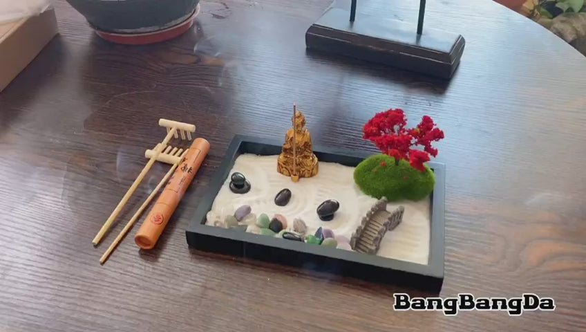 - Find your inner peace even during stressful work days with this Meditation Zen Garden. This desktop rock zen garden with a Buddha statue for sight, autumn maple trees,Incense for smell, mini bamboo rakes for touch, Zen garden bridge for sound, river rocks for nature.Overcome anxiety by tending your own littleplace of peace.