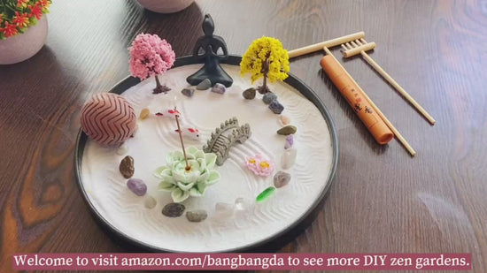 - HANDCRAFTED WOOD TRAY This Zen Garden tray is in DIA 9.5", the size is perfect for your coffee table, desk, fireplace or countertop. It comes with 2 different styles of rakes, ceramic lotus incense holders, A box of incenses, Meditation Yoga Statue, Sphere to make patterns,nature crystal stones,cherry blooms etc. All accessories and tools you need to relieve stress and kill boredom while at work or home.