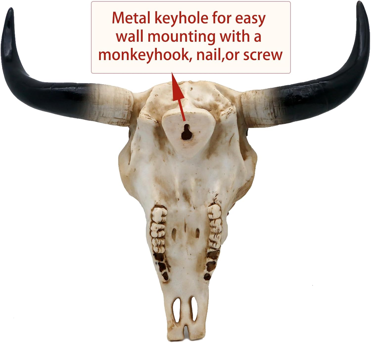 - Perfect Size - This Wall Mounted Buffalo Skull is equipped with a sturdy hanger holes on the back for more stable hanging and easy installation. The bull skull measures 12.2inches long from horn to horn, 10.9 inches tall and weighs 1.6 lbs. Our Longhorn Bull Skull Wall Decor is carefully handcrafted from high quality resin for a sturdy feel. No assembly is required for use.